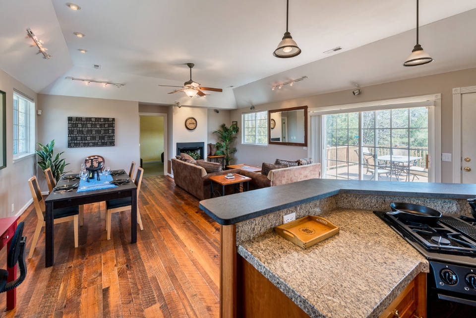 Our two-bedroom/ two bathroom upstairs suite offers a full kitchen, private deck with sweeping vineyard views, and extra space for groups of friends or that perfect family getaway.